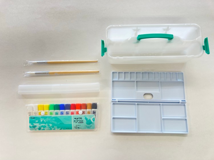 金谷小学校 画材セット セット内容・ぺんてるメッシュバッグ・筆筒・ぺんてるえのぐ ポリチューブ12色13本入り・ぺんてるパレット2つ折り ・ぺんてる大型筆洗バケツ水返し付・ナイロン画筆 8号・ナイロン画筆 16号