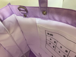 肩ベルト用金具付き 内ポケットには、名前欄があります。